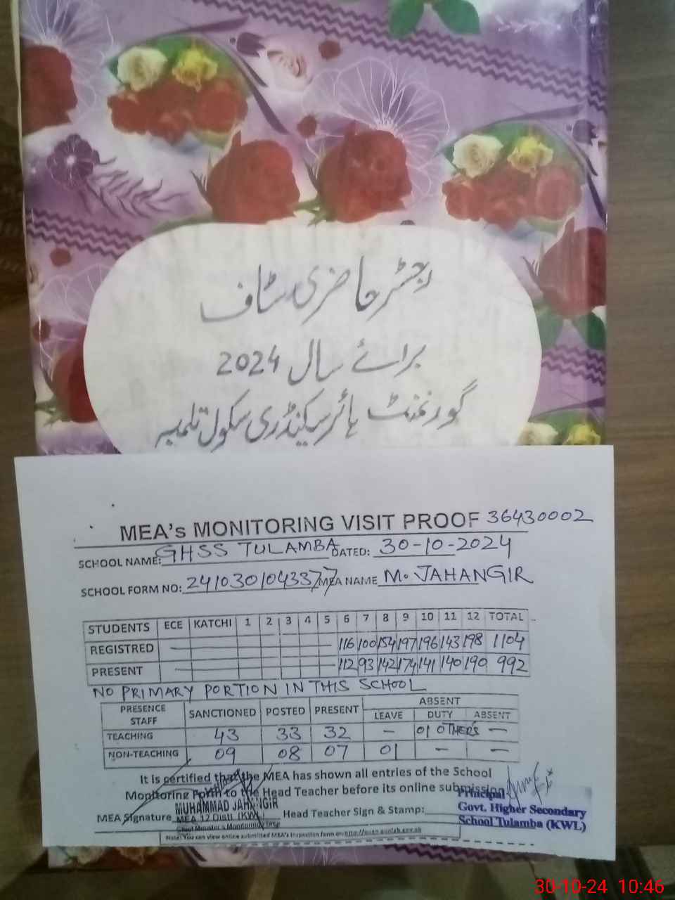 | Certified that this School was Inspected by the Undersigned MEA/DMO Today and the Information Stated Above is as Per Record. | |||||