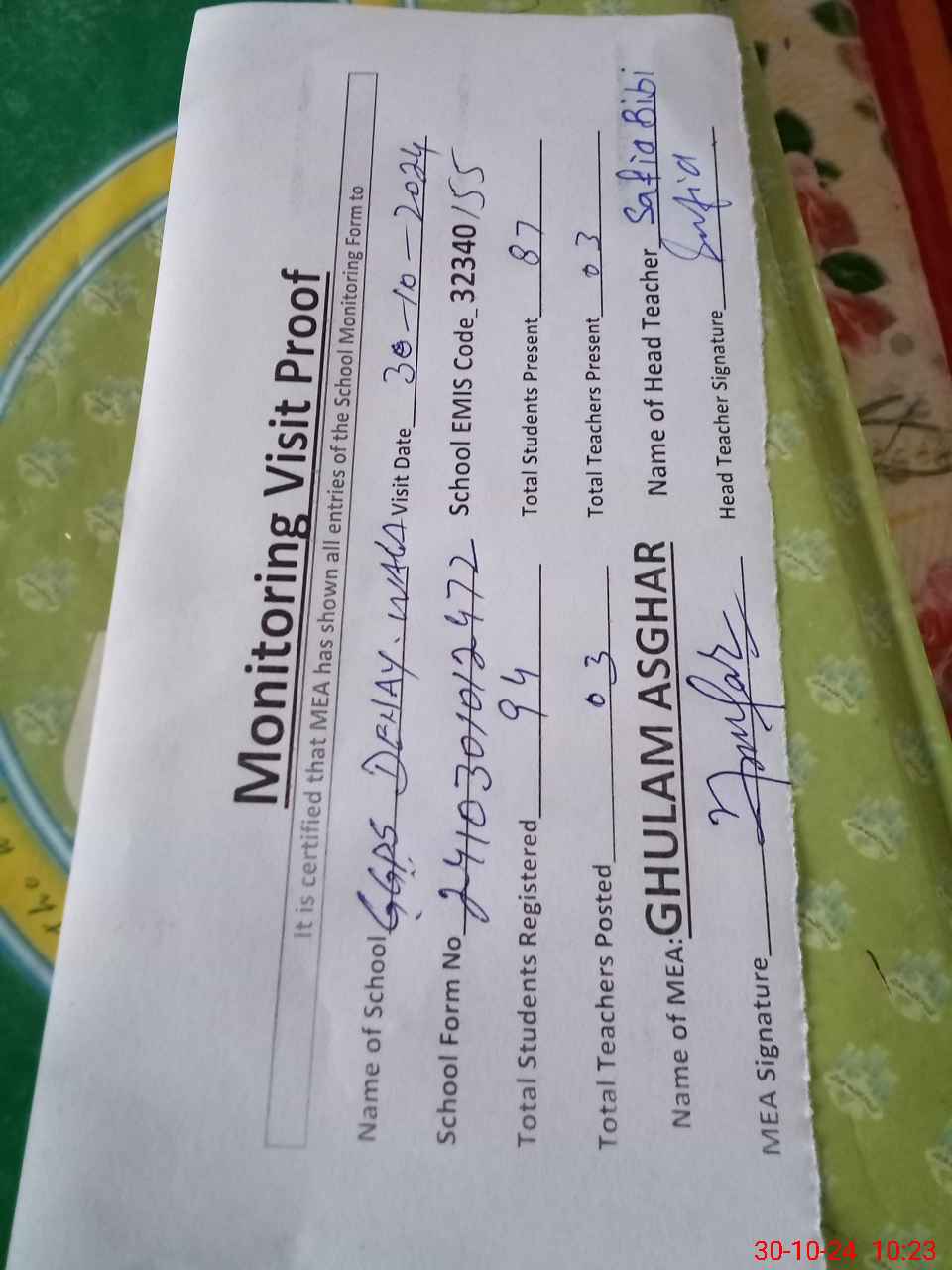 | Attendance Register | Head Teacher | MEA with School | Visit Proof |