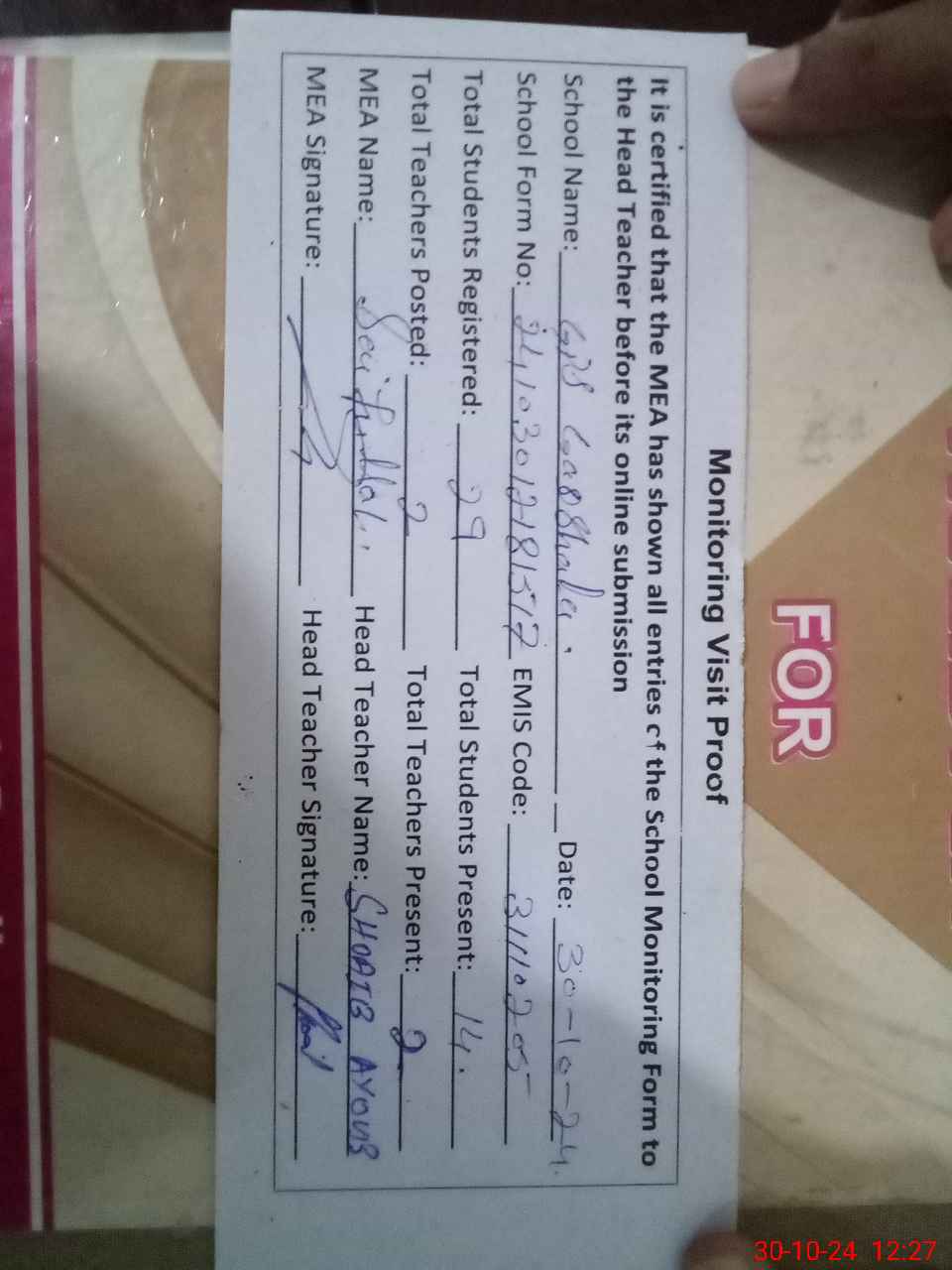 | Attendance Register | Head Teacher | MEA with School | Visit Proof |