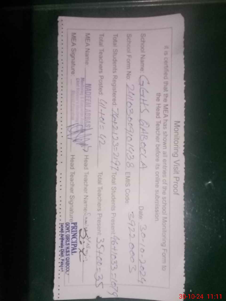 | Remarks (Use Separate Page if Required): Principal Samina Yasmeen was found absent reached at 09300 hrs | |||||