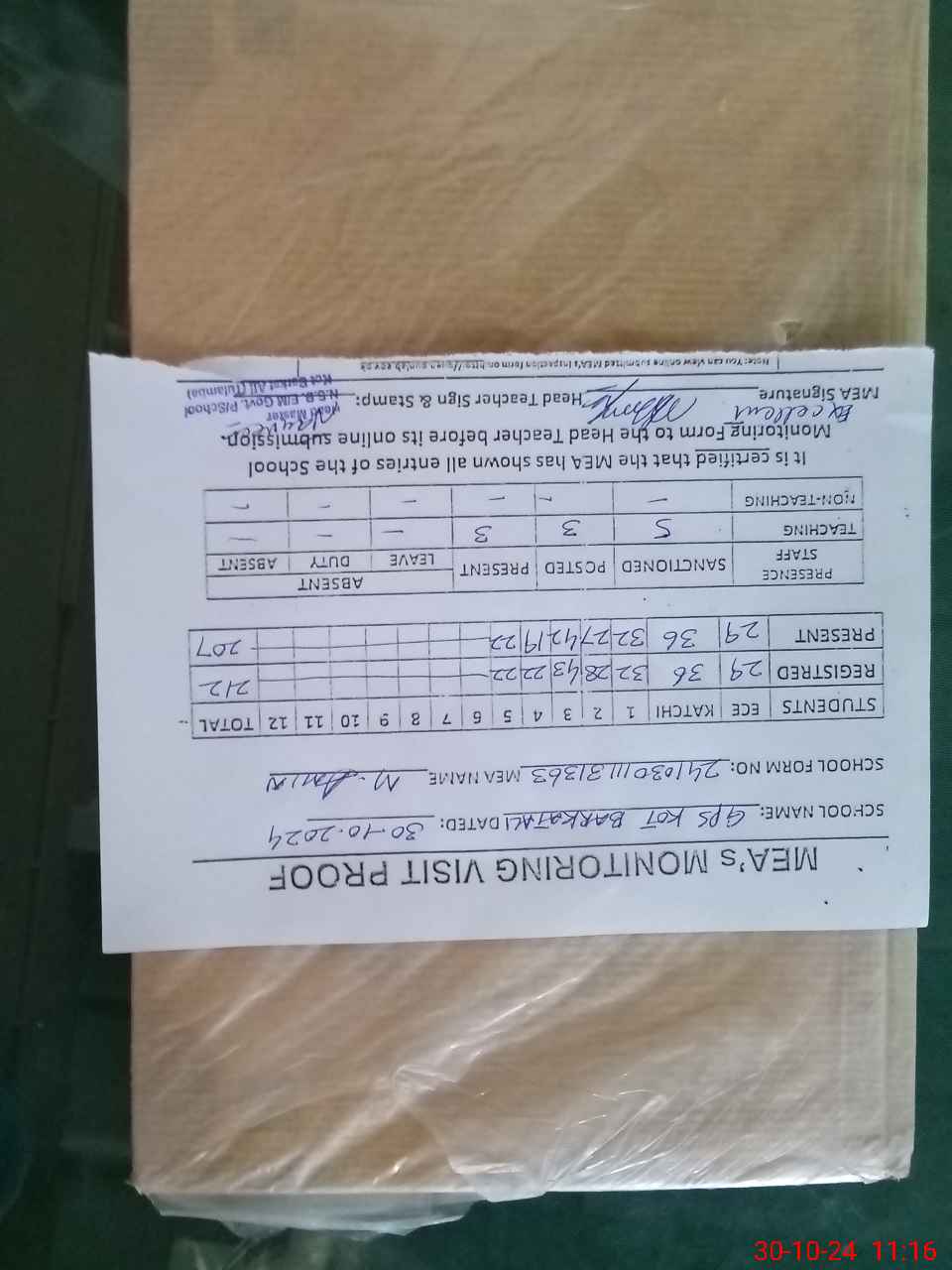 | Attendance Register | Head Teacher | MEA with School | Visit Proof |