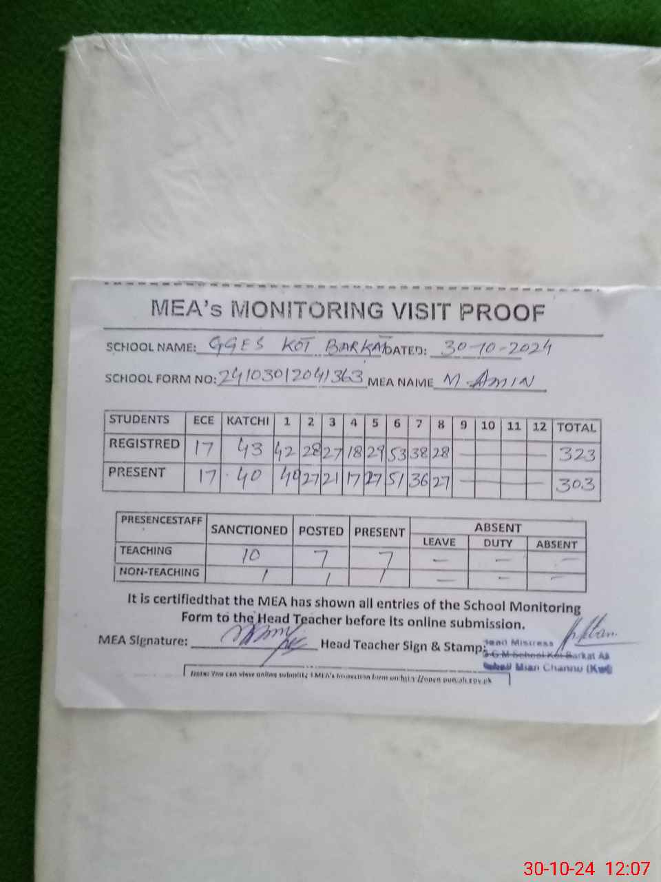| Attendance Register | Head Teacher | MEA with School | Visit Proof |
