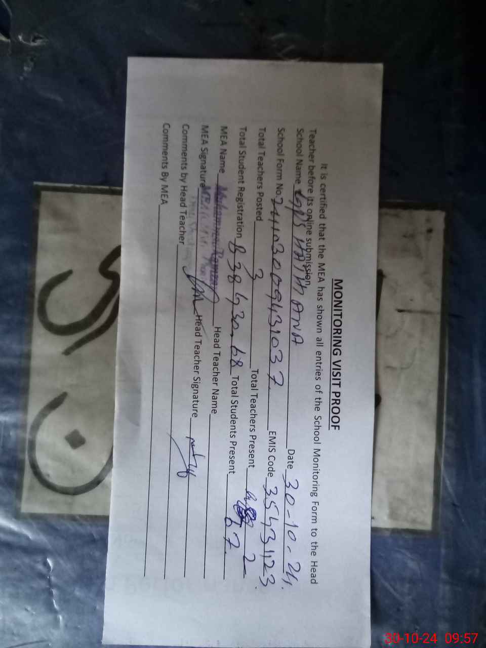 | Attendance Register | Head Teacher | MEA with School | Visit Proof |