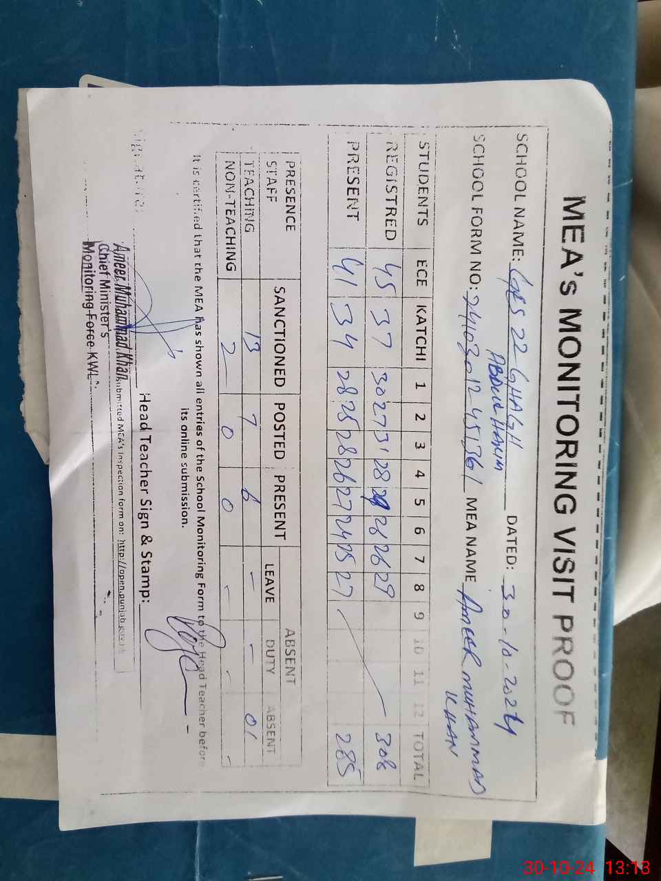 | Attendance Register | Head Teacher | MEA with School | Visit Proof |