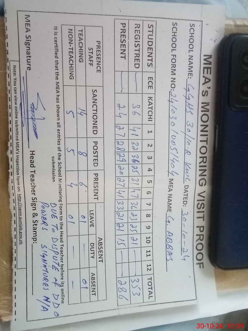 | Certified that this School was Inspected by the Undersigned MEA/DMO Today and the Information Stated Above is as Per Record. | |||||