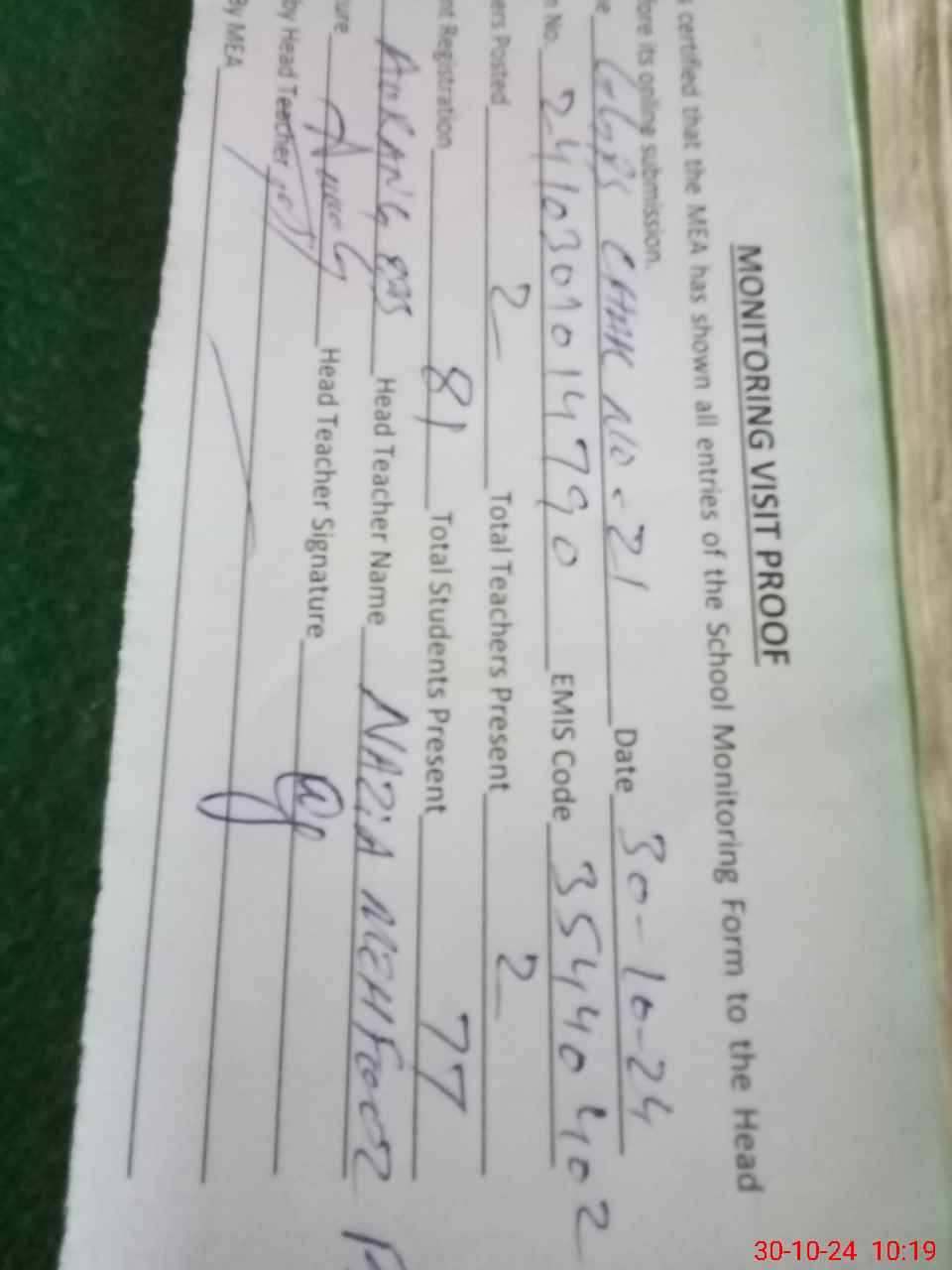 | Attendance Register | Head Teacher | MEA with School | Visit Proof |