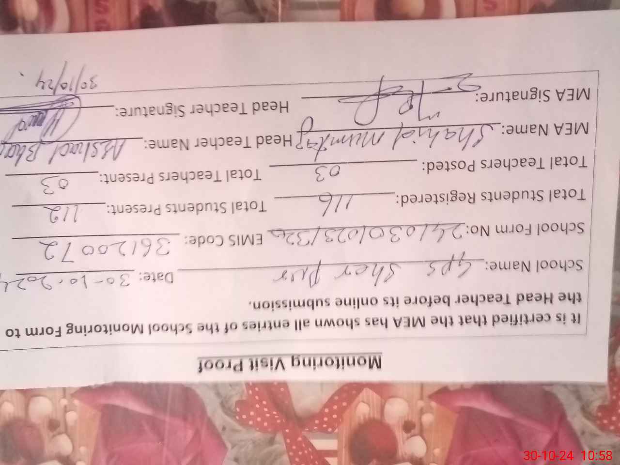 | Certified that this School was Inspected by the Undersigned MEA/DMO Today and the Information Stated Above is as Per Record. | |||||