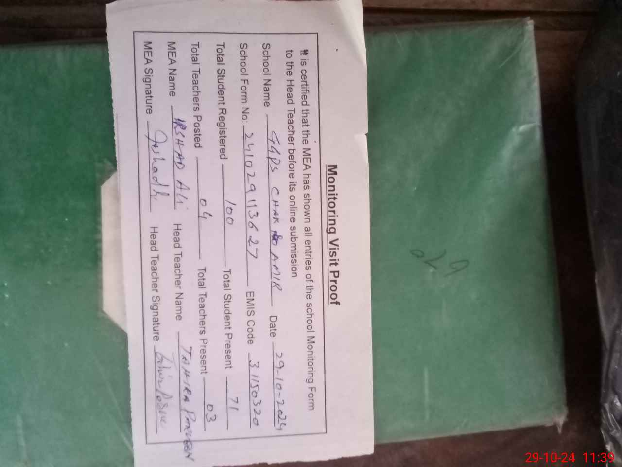 | Attendance Register | Head Teacher | MEA with School | Visit Proof |