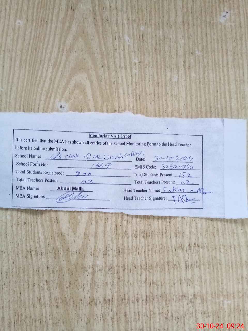 | Attendance Register | Head Teacher | MEA with School | Visit Proof |