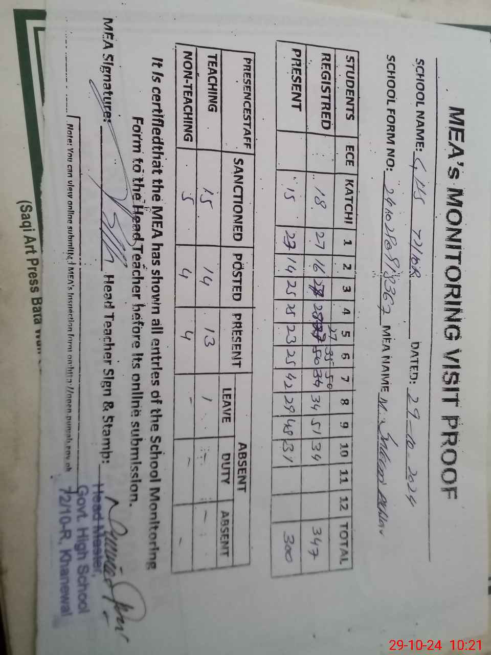 | Attendance Register | Head Teacher | MEA with School | Visit Proof |
