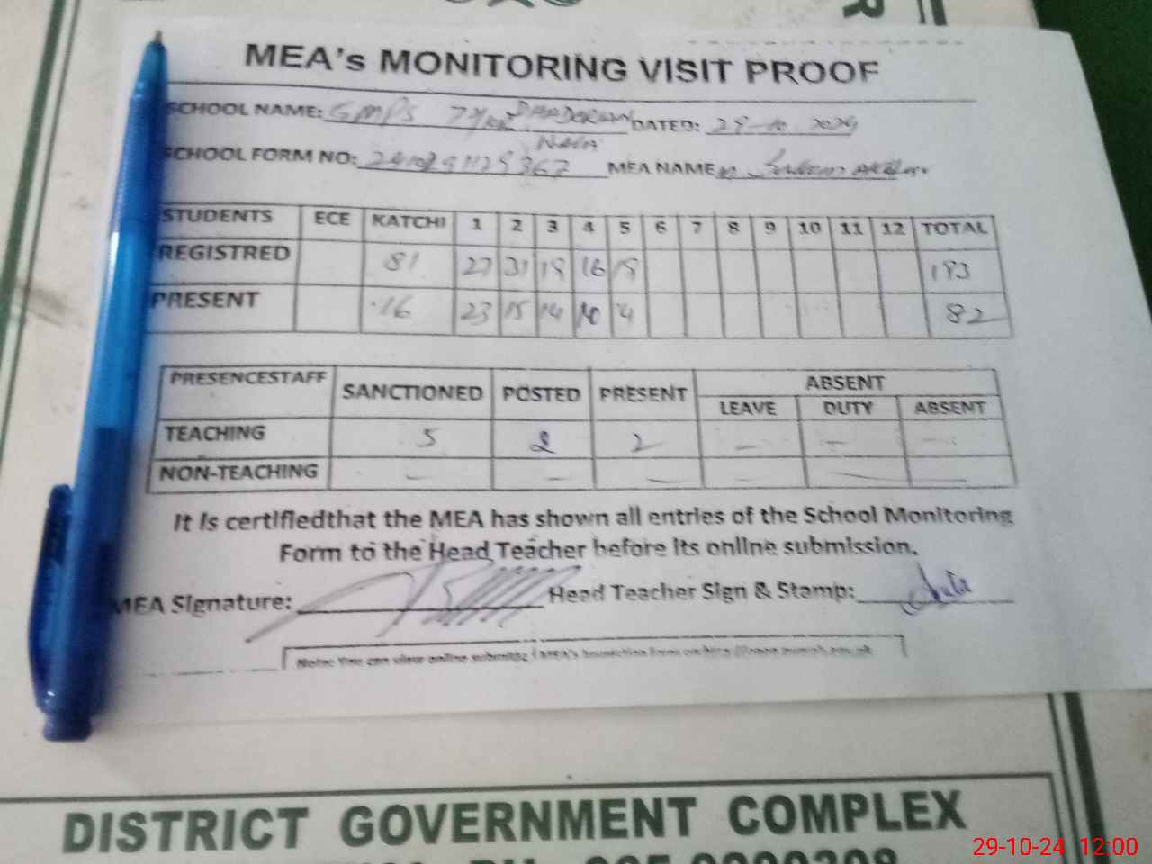 | Attendance Register | Head Teacher | MEA with School | Visit Proof |