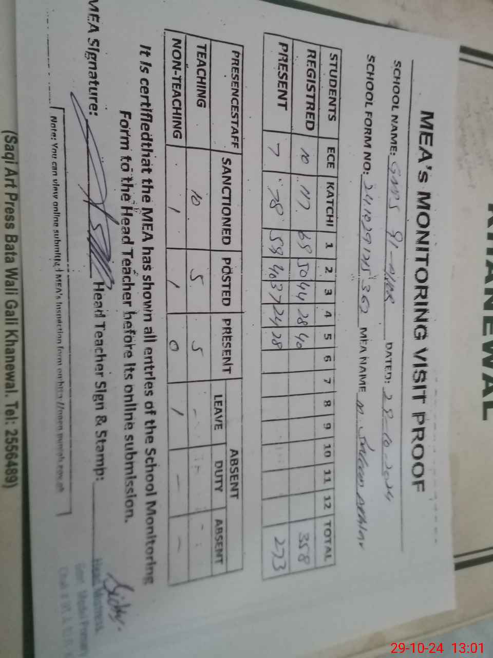 | Attendance Register | Head Teacher | MEA with School | Visit Proof |