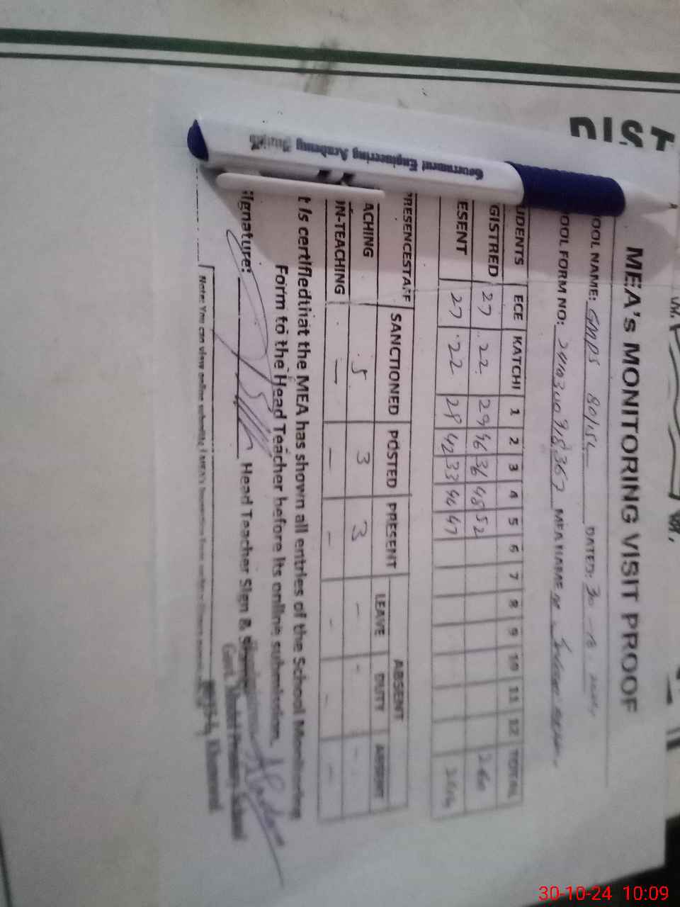 | Attendance Register | Head Teacher | MEA with School | Visit Proof |