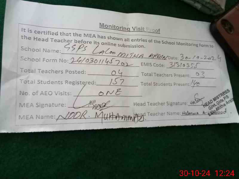| Certified that this School was Inspected by the Undersigned MEA/DMO Today and the Information Stated Above is as Per Record. | |||||