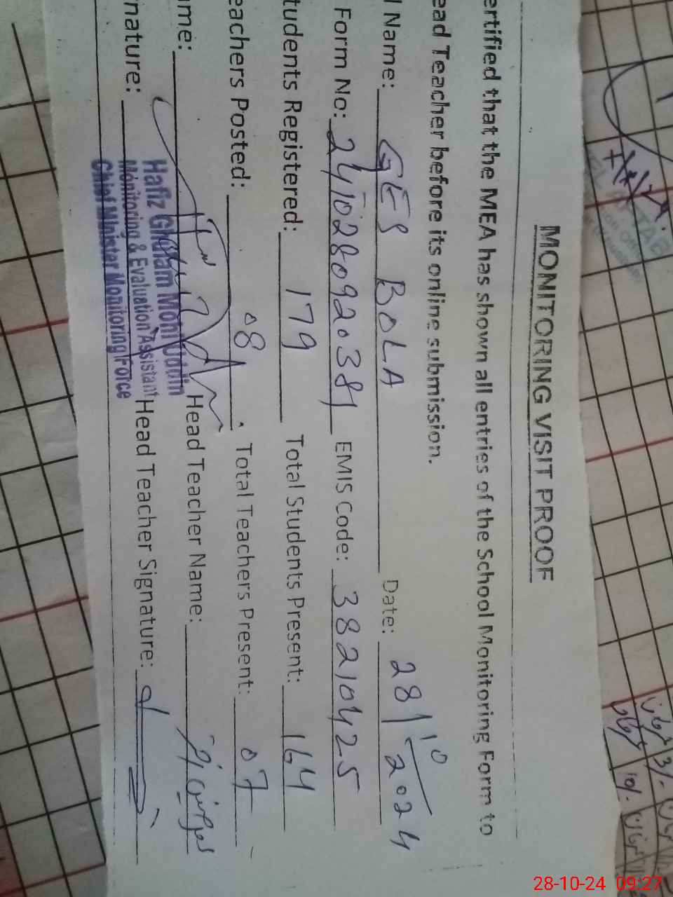 | Attendance Register | Head Teacher | MEA with School | Visit Proof |