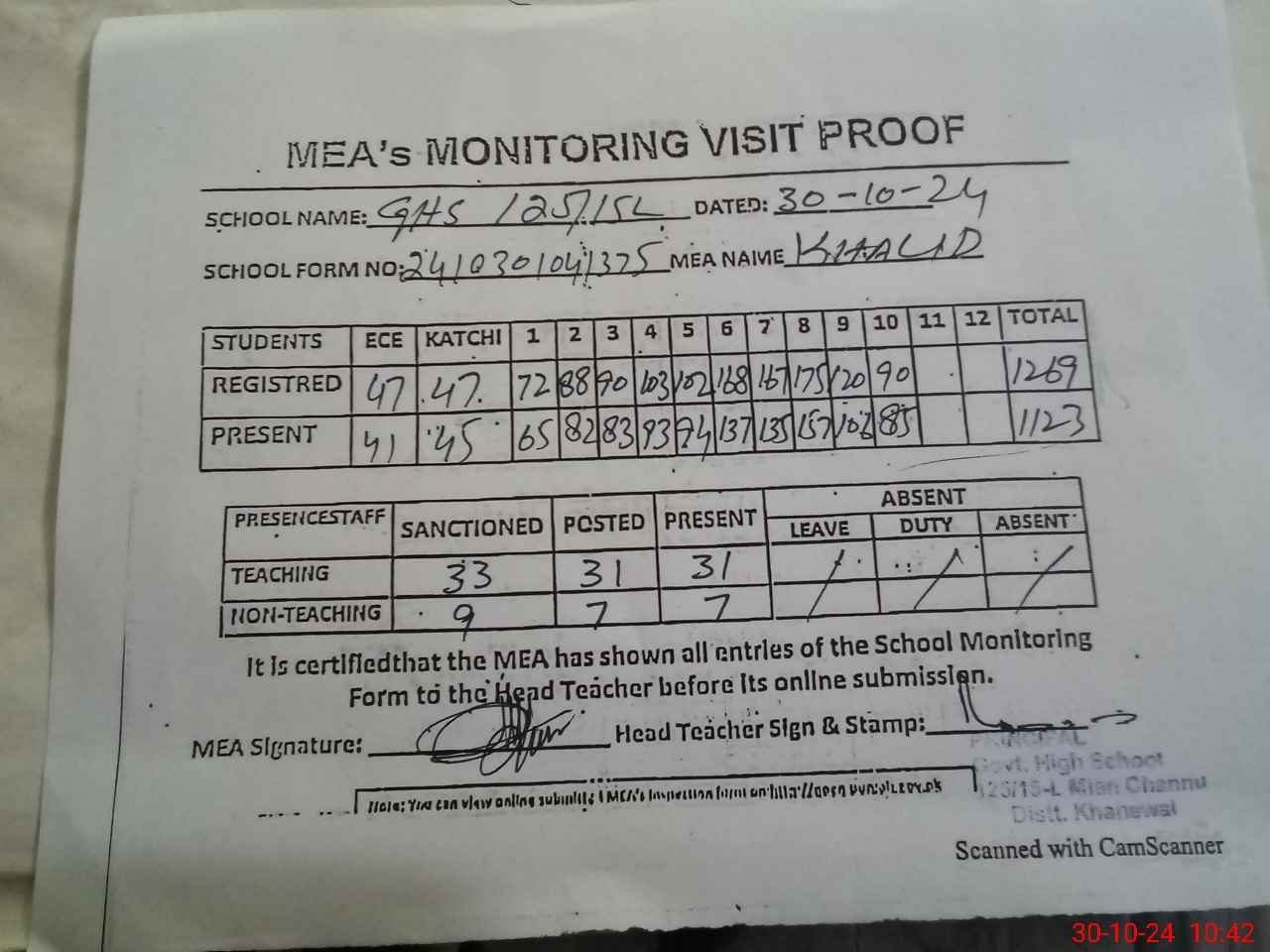 | EMIS Code: 36430019 | Name of School: GHS 125/15-L, MIAN CHANNU | |||