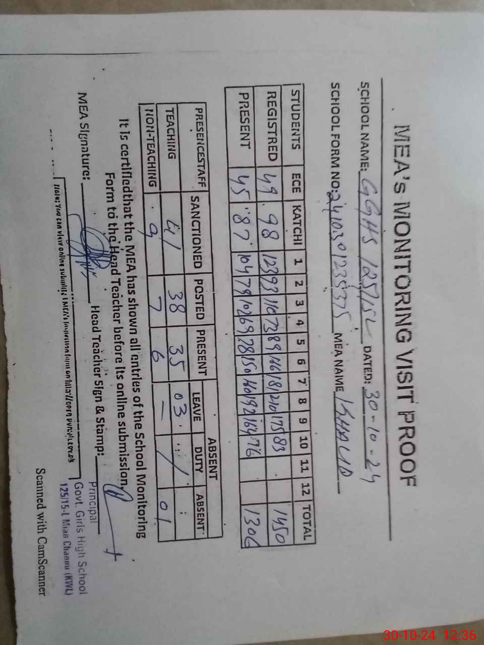| Attendance Register | Head Teacher | MEA with School | Visit Proof |