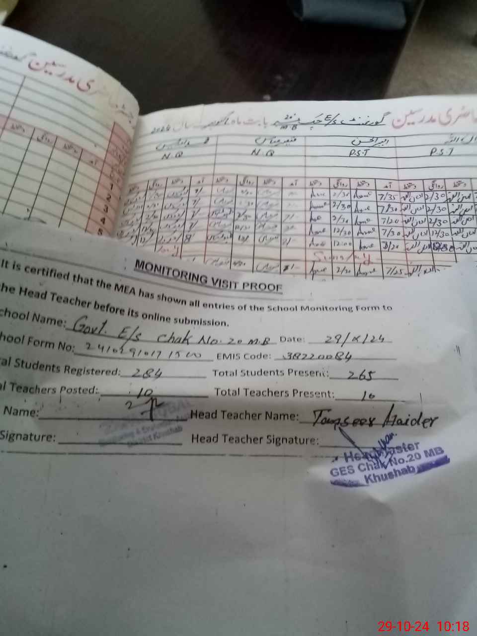 | Attendance Register | Head Teacher | MEA with School | Visit Proof |