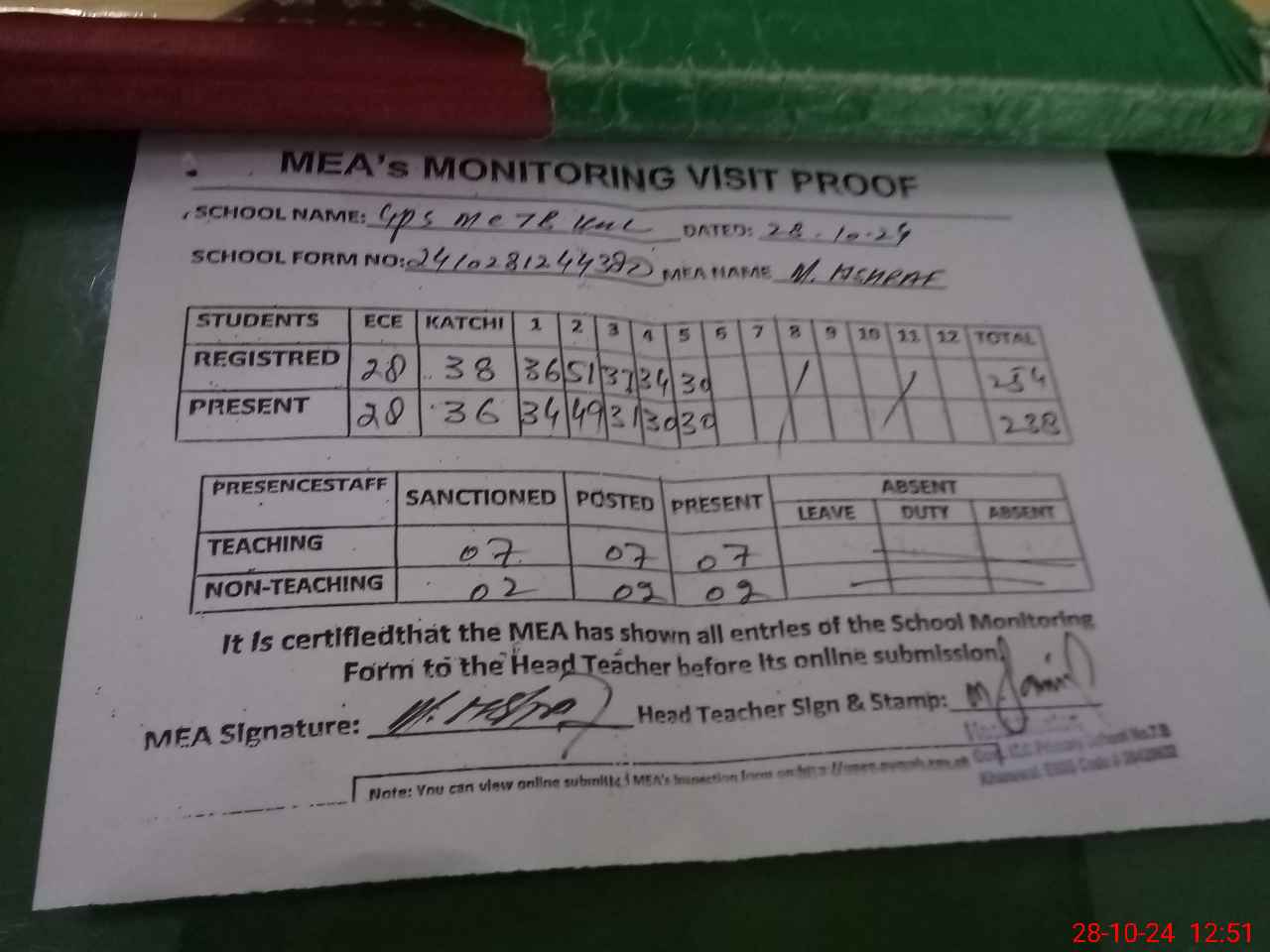 | Attendance Register | Head Teacher | MEA with School | Visit Proof |