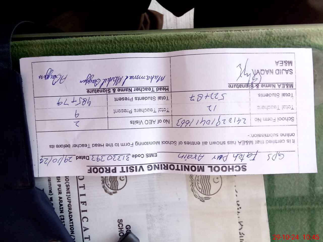 | Monitoring Date: 29-10-2024 | Start Time: 29-10-2024 10:26 AM | End Time: 29-10-2024 10:47 AM | Name of MEA: Sa**** ulHa**** | |