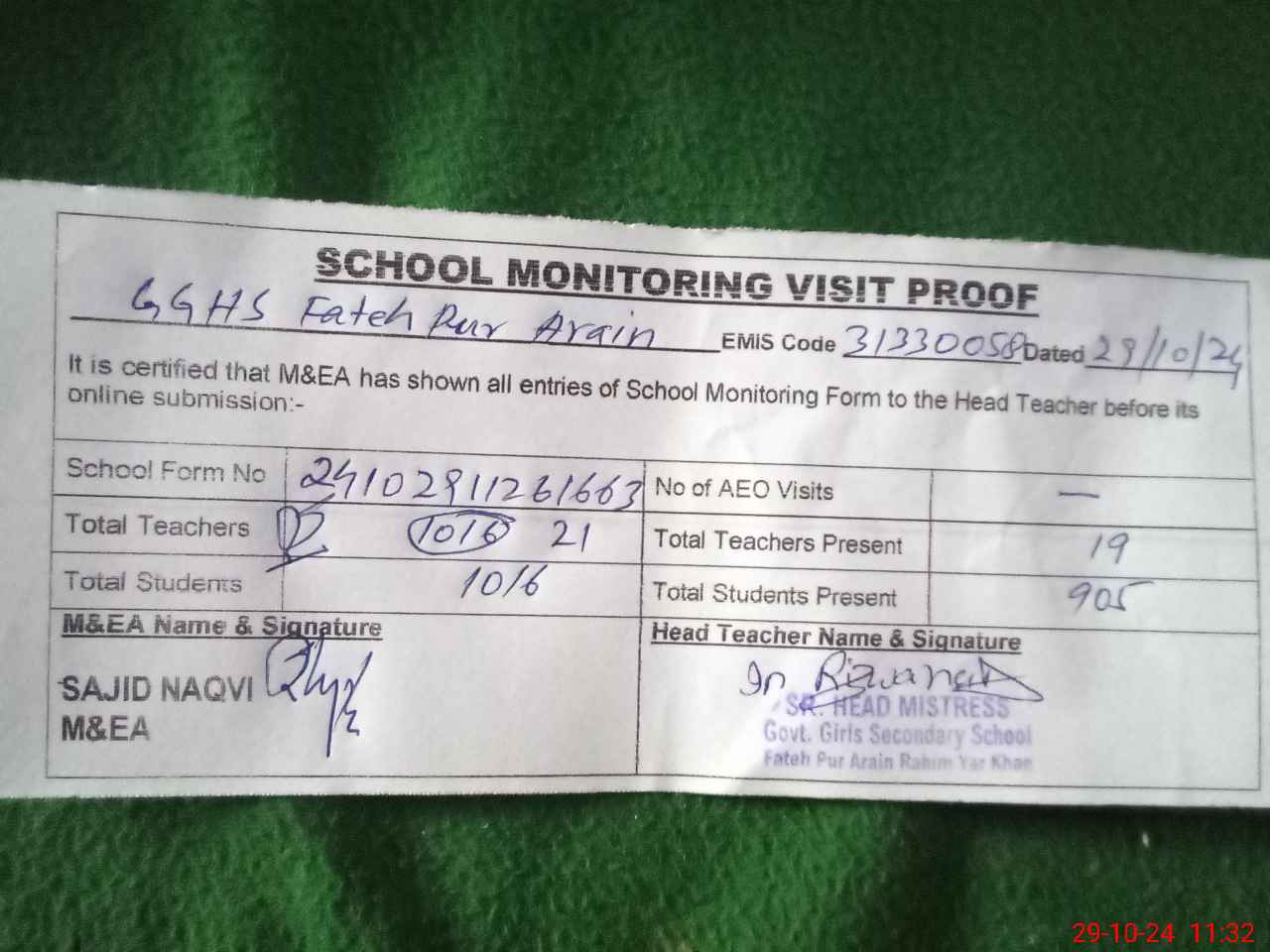 | Monitoring Date: 29-10-2024 | Start Time: 29-10-2024 10:52 AM | End Time: 29-10-2024 11:42 AM | Name of MEA: Sa**** ulHa**** | |