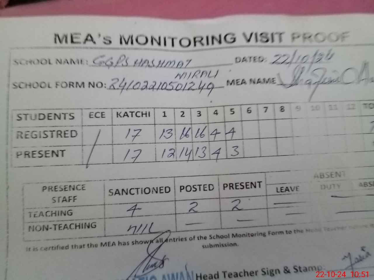 | Attendance Register | Head Teacher | MEA with School | Visit Proof |