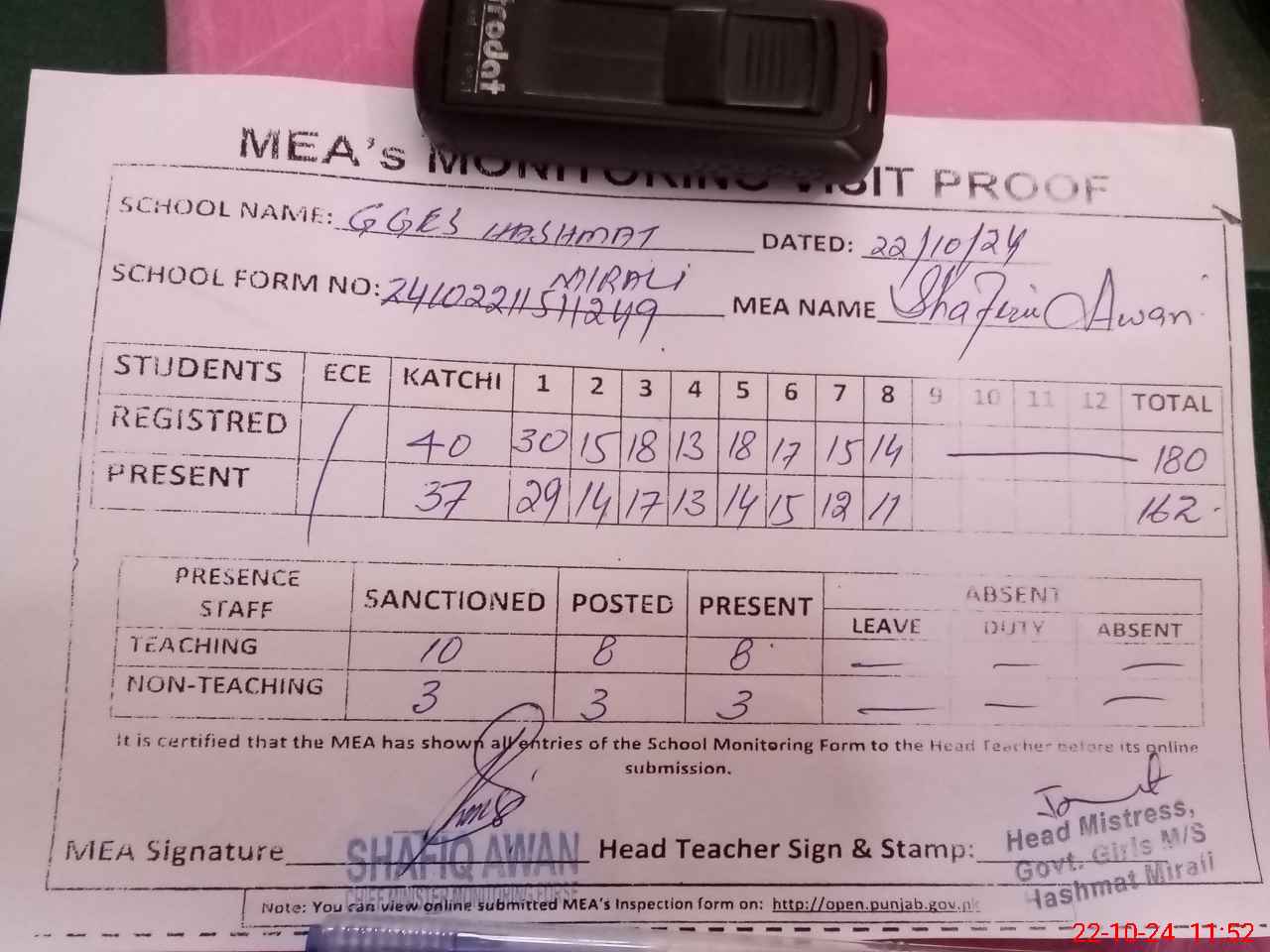 | Certified that this School was Inspected by the Undersigned MEA/DMO Today and the Information Stated Above is as Per Record. | |||||