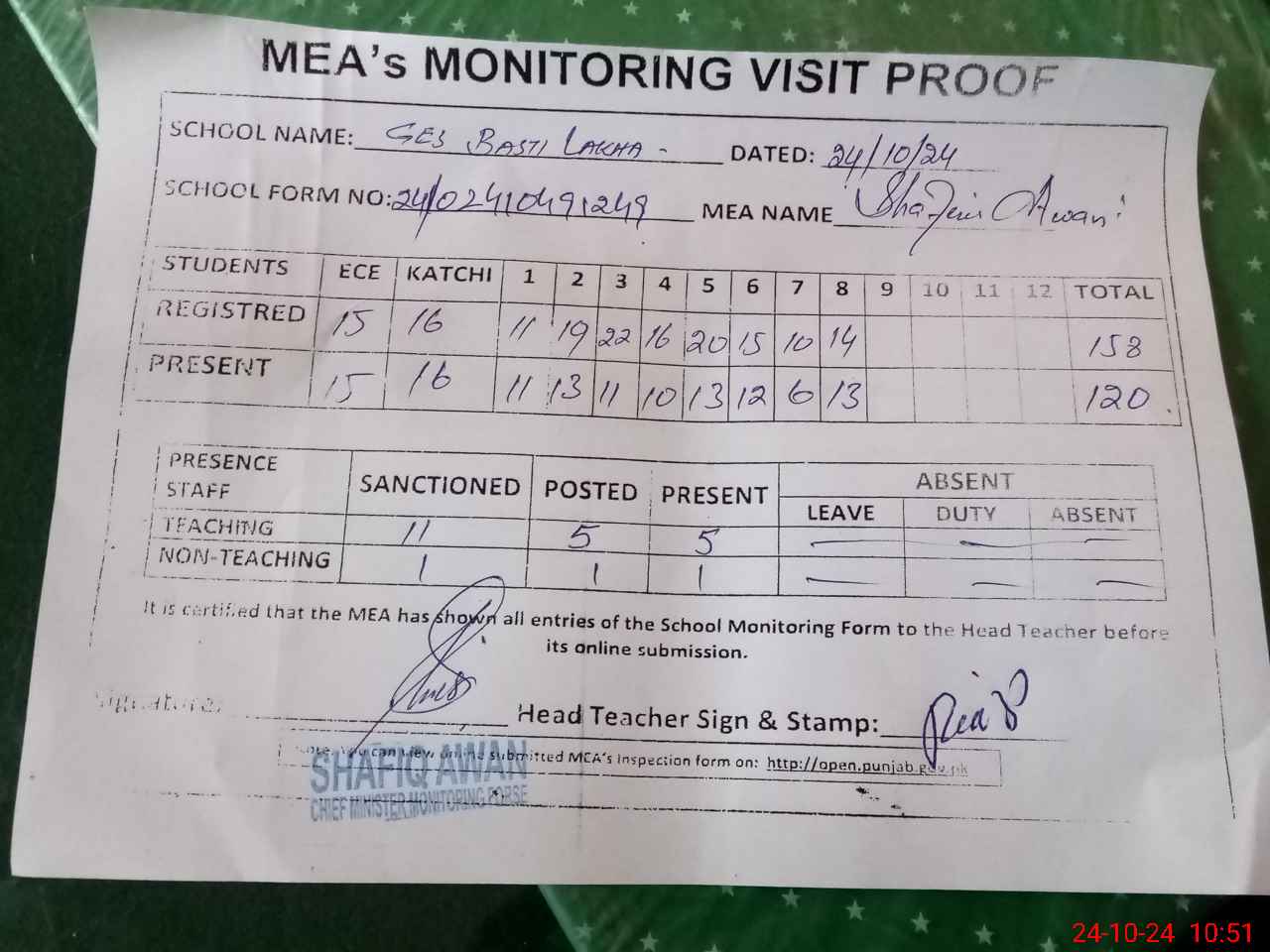 | Attendance Register | Head Teacher | MEA with School | Visit Proof |