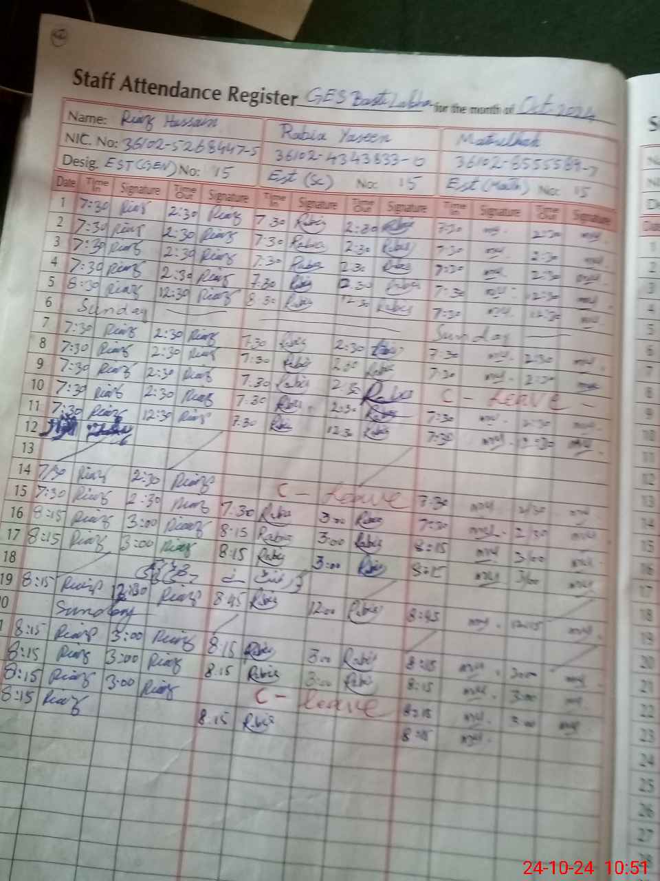 | CNIC | Full Name | Designation | R/C | Absence During Last Calender Month |