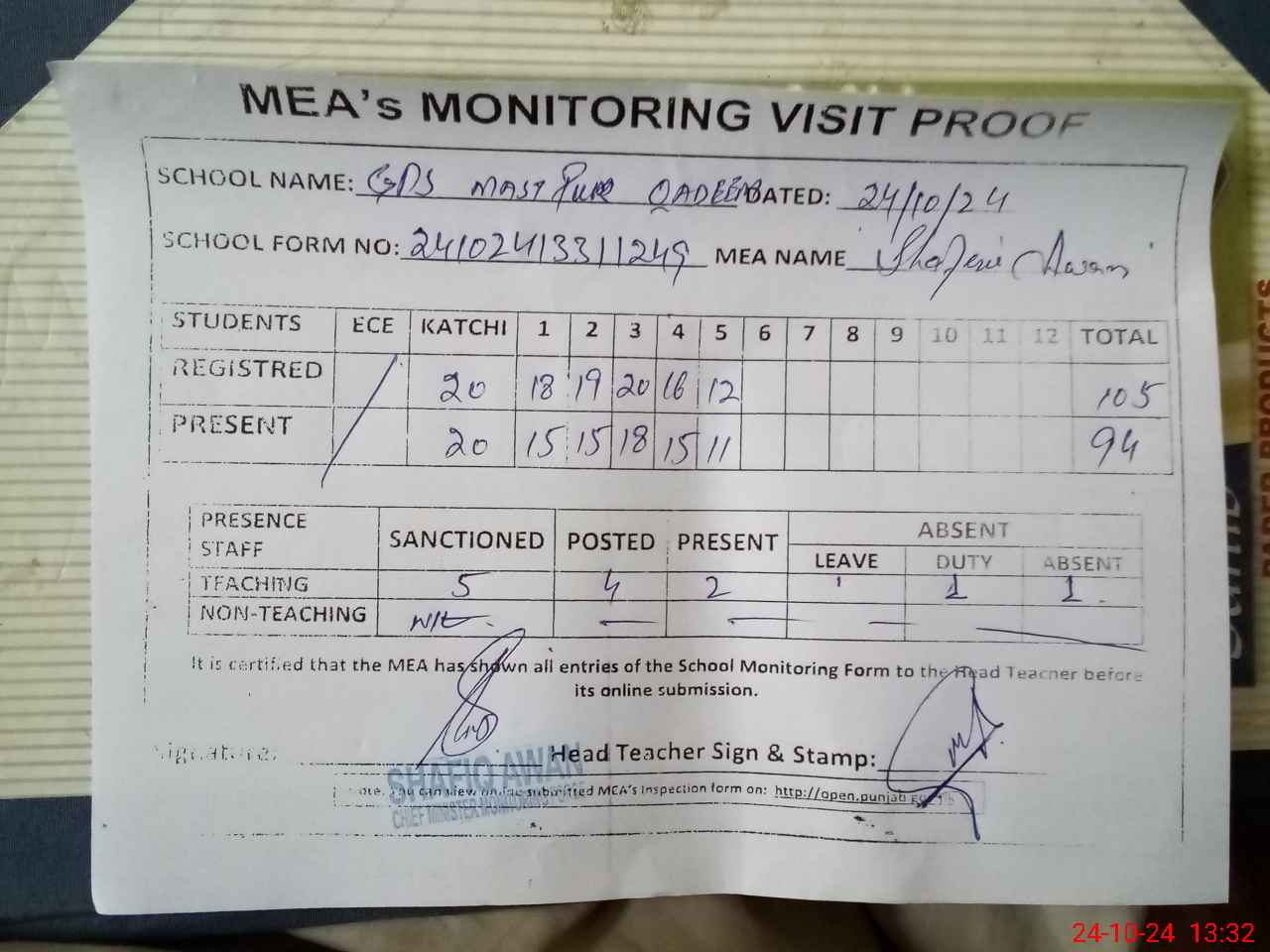 | Attendance Register | Head Teacher | MEA with School | Visit Proof |