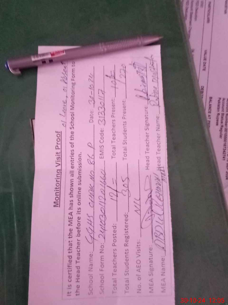 | Attendance Register | Head Teacher | MEA with School | Visit Proof |