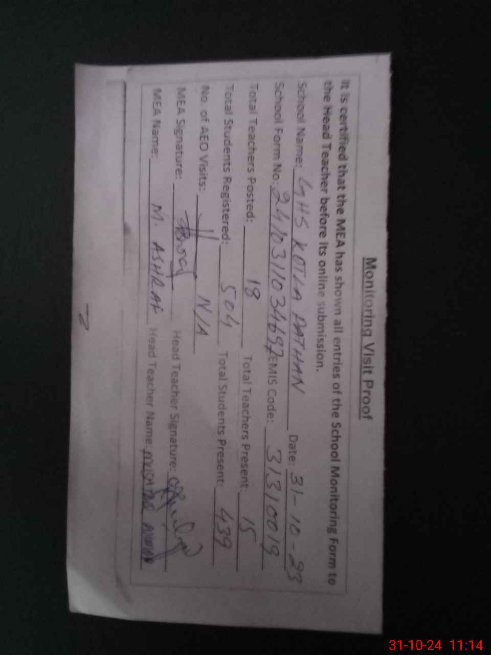 | Attendance Register | Head Teacher | MEA with School | Visit Proof |