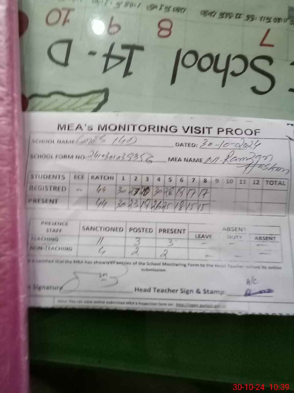 | Certified that this School was Inspected by the Undersigned MEA/DMO Today and the Information Stated Above is as Per Record. | |||||