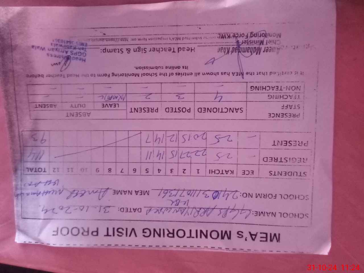 | Attendance Register | Head Teacher | MEA with School | Visit Proof |