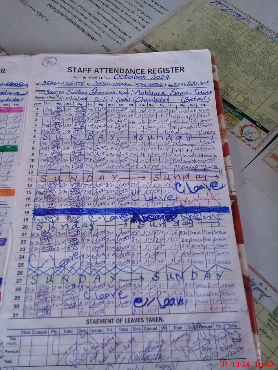 | CNIC | Full Name | Designation | R/C | Absence During Last Calender Month |