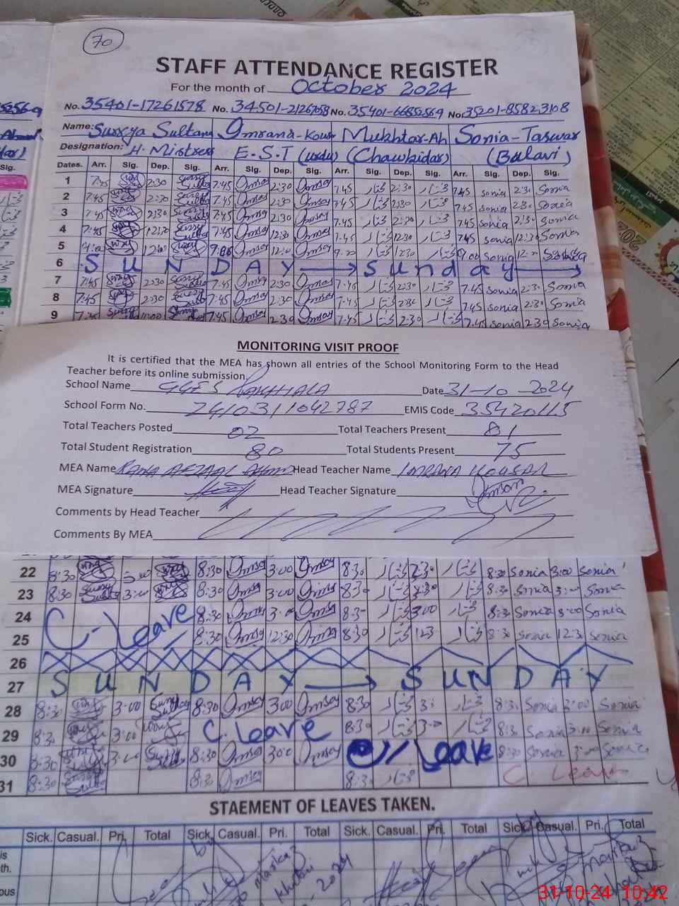 | Attendance Register | Head Teacher | MEA with School | Visit Proof |