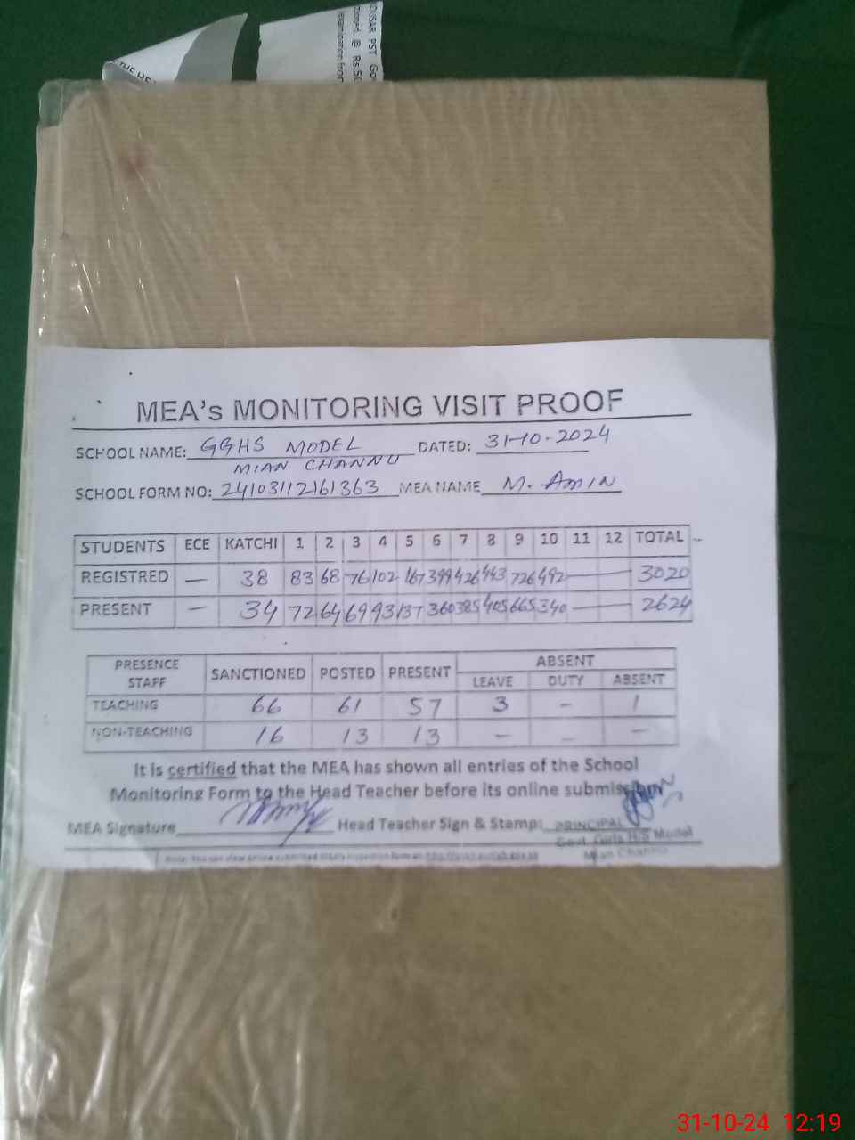 | Attendance Register | Head Teacher | MEA with School | Visit Proof |