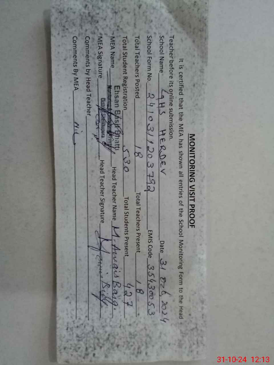 | Attendance Register | Head Teacher | MEA with School | Visit Proof |