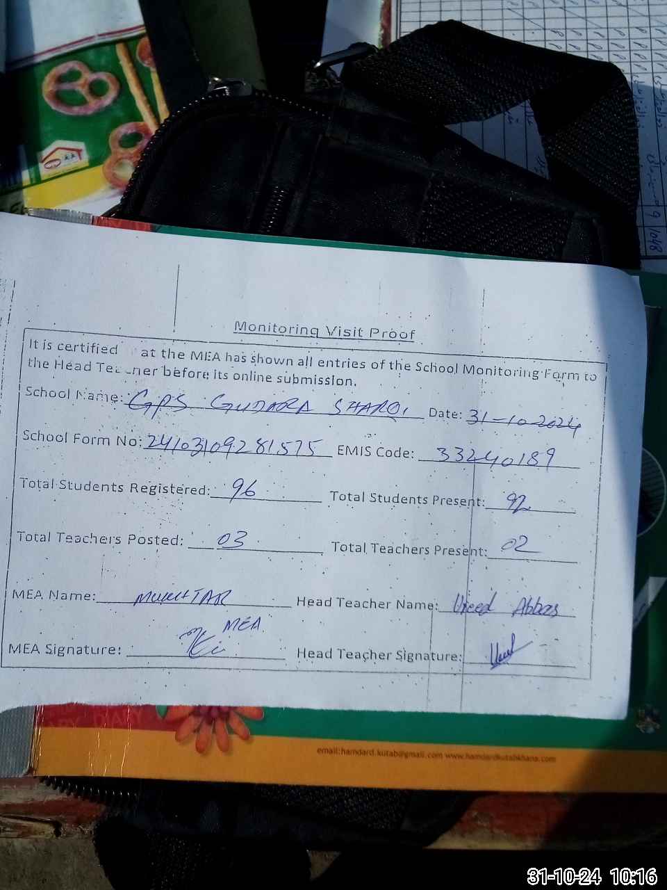 | Attendance Register | Head Teacher | MEA with School | Visit Proof |