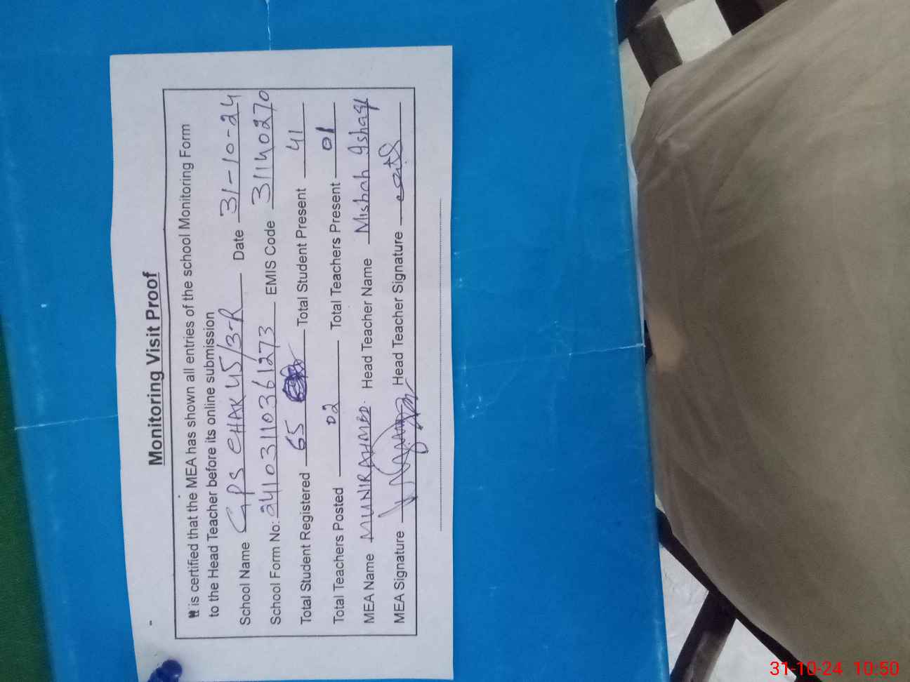 | Remarks (Use Separate Page if Required): NSB record not shown to MEA Male head Teacher is on leave then visit proof performa signature by female teacher | |||||