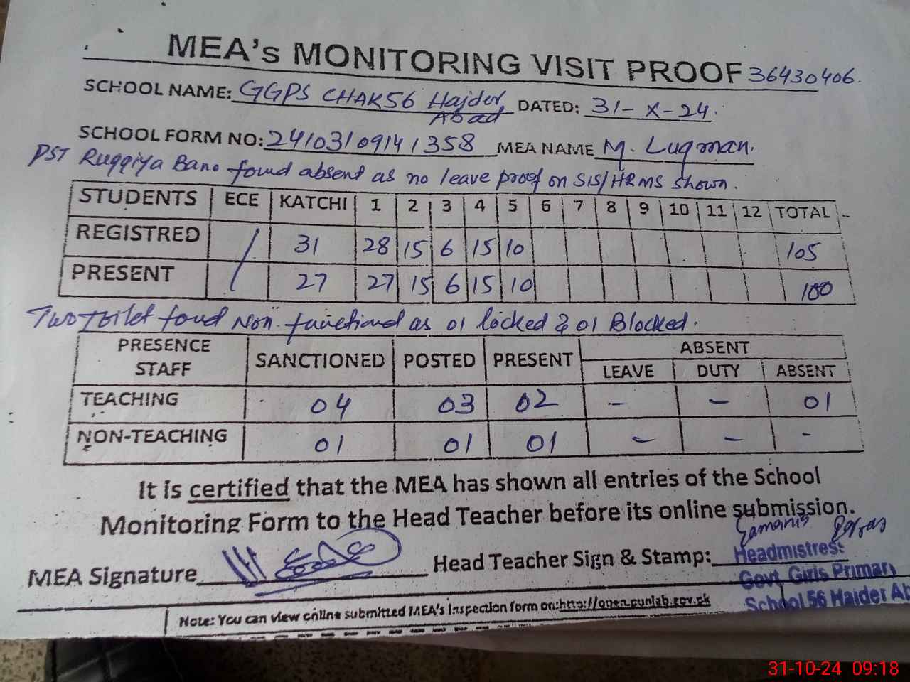 | Remarks (Use Separate Page if Required): PST Ruqiyya Bibi found absent as no leave proof on SIS or HRMS Two toilets were found in non functional condition | |||||