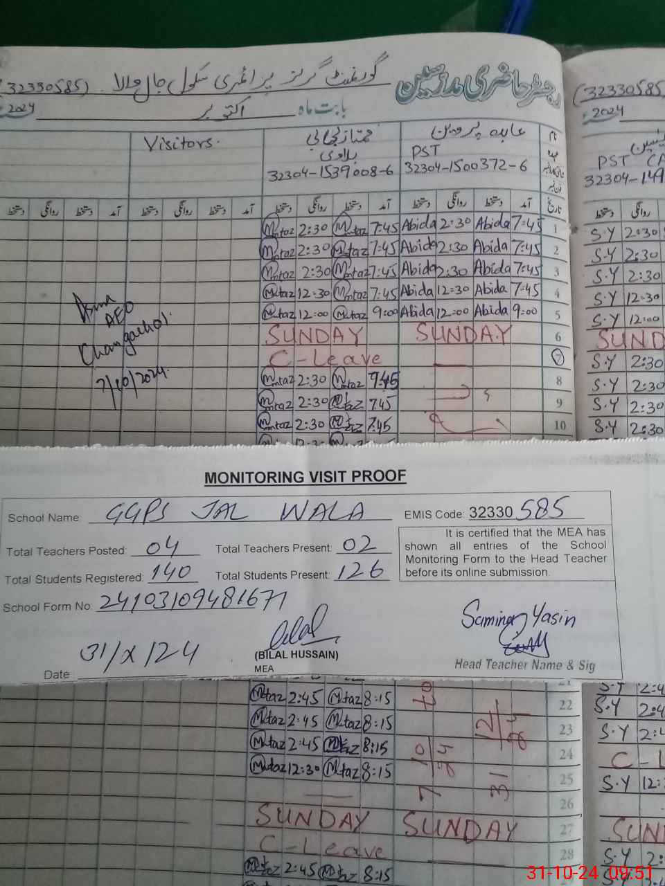 | Attendance Register | Head Teacher | MEA with School | Visit Proof |