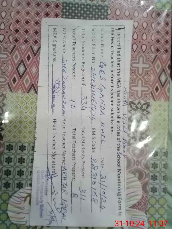 | EMIS Code: 38310168 | Name of School: GHS GANDA KHEL | |||