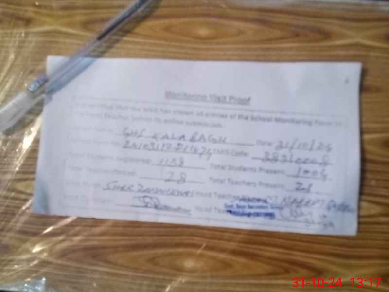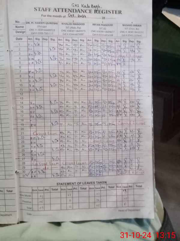 | Total no. of Classrooms: 20 No. of Classrooms Used for Teaching: 13 No. of Classrooms Storing Old Furniture, FTBs, etc: 0Comments if Any: Nisar Haider was un authorised wef 12 September 2024 his leave record was not available and not shown to MEA during visit |