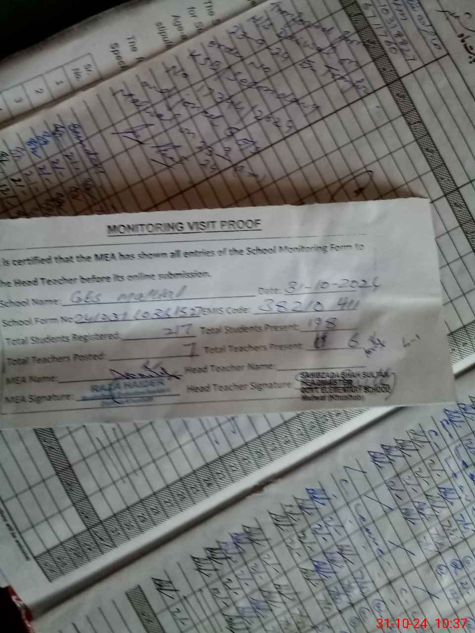| Attendance Register | Head Teacher | MEA with School | Visit Proof |