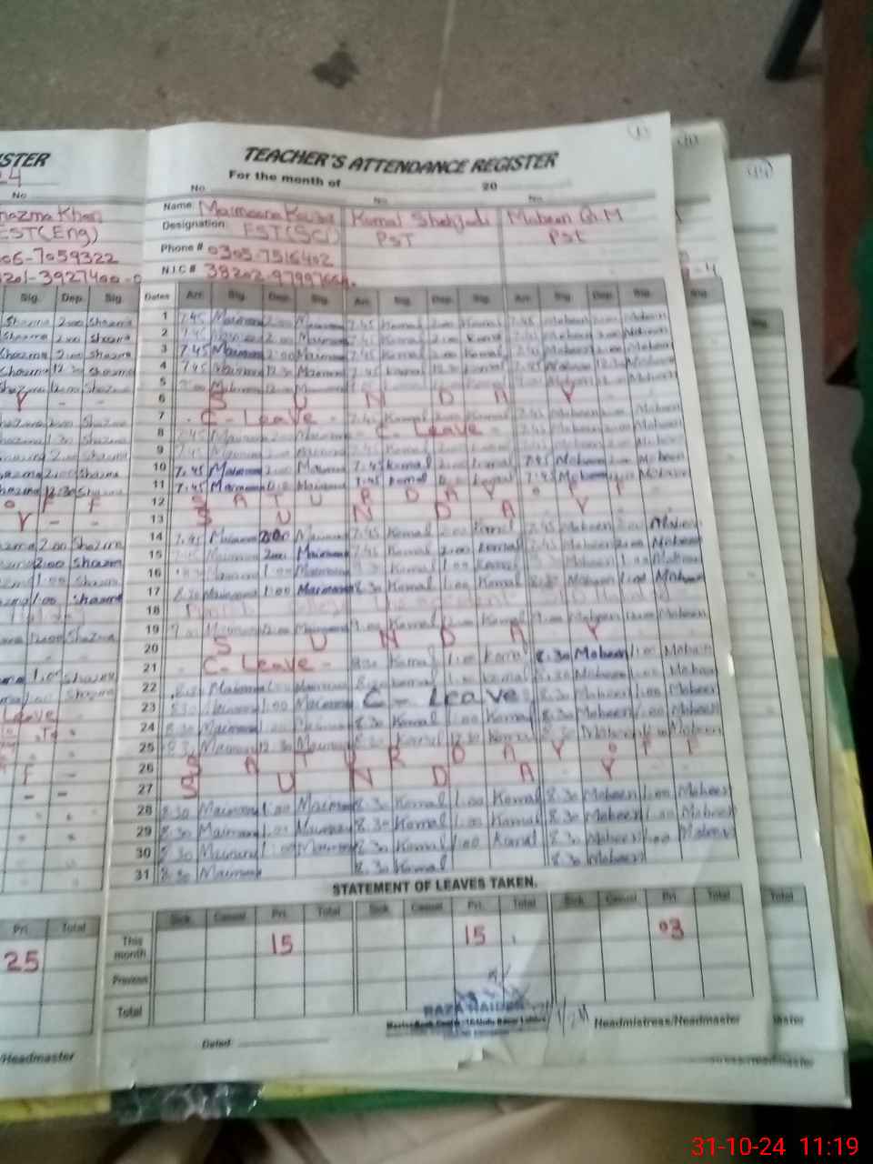 | CNIC | Full Name | Designation | R/C | Absence During Last Calender Month |