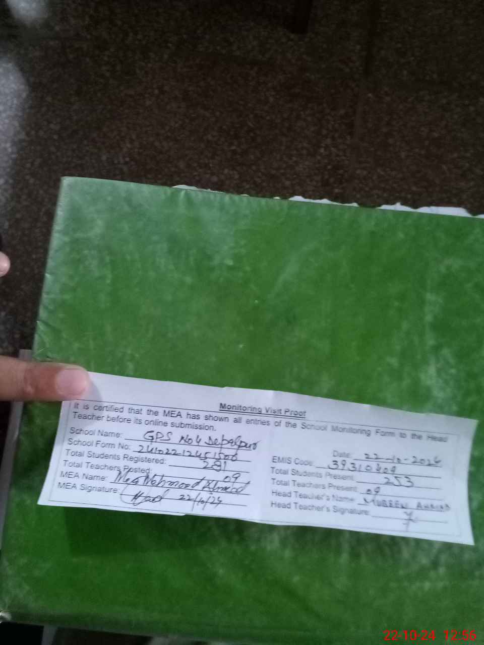 | Attendance Register | Head Teacher | MEA with School | Visit Proof |