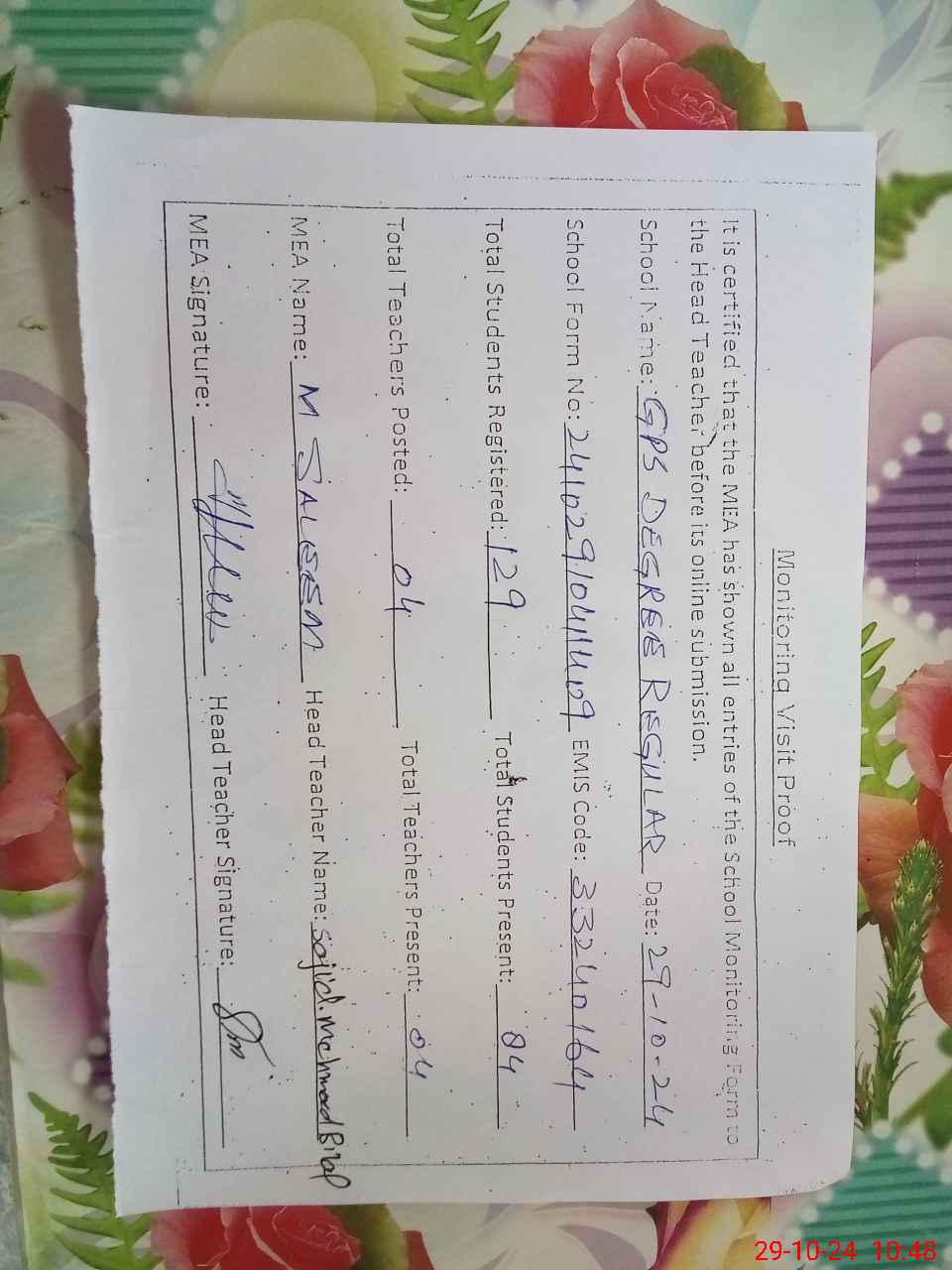 | Certified that this School was Inspected by the Undersigned MEA/DMO Today and the Information Stated Above is as Per Record. | |||||