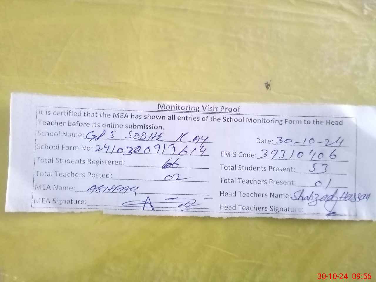 | Attendance Register | Head Teacher | MEA with School | Visit Proof |