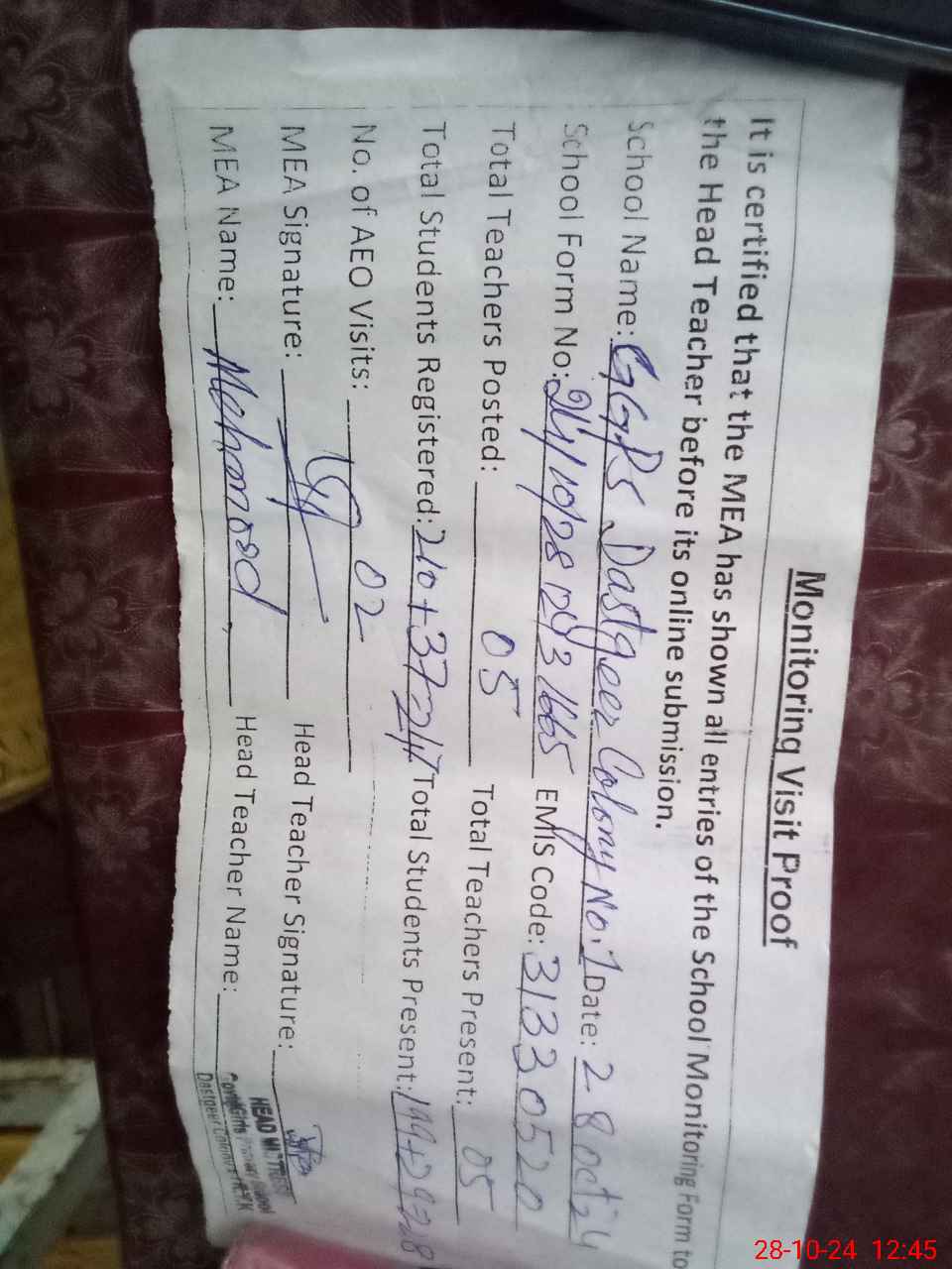 | Attendance Register | Head Teacher | MEA with School | Visit Proof |